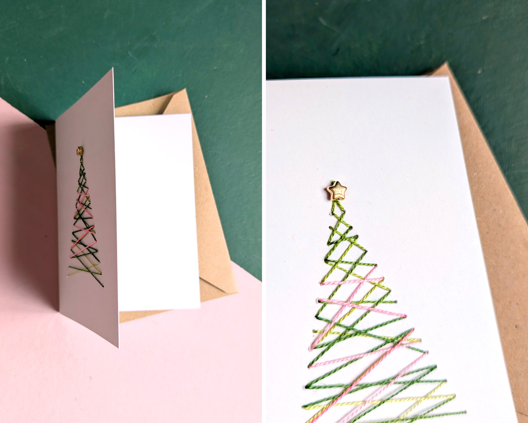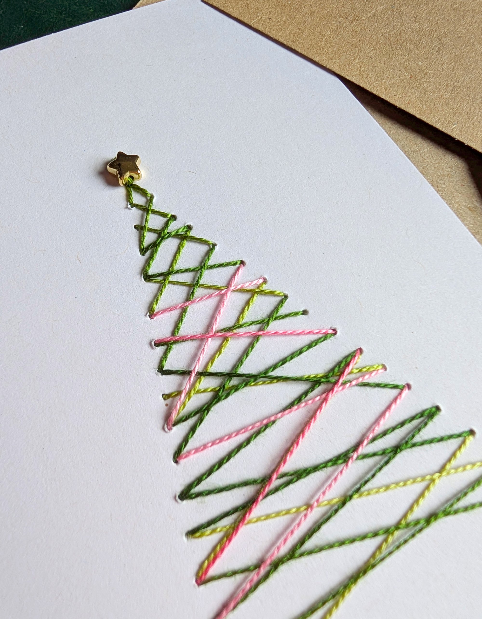 Carte de voeux brodée à la main par Cactus Tatoué avec détails : petite perle étoile en haut du sapin + enveloppe kraft.