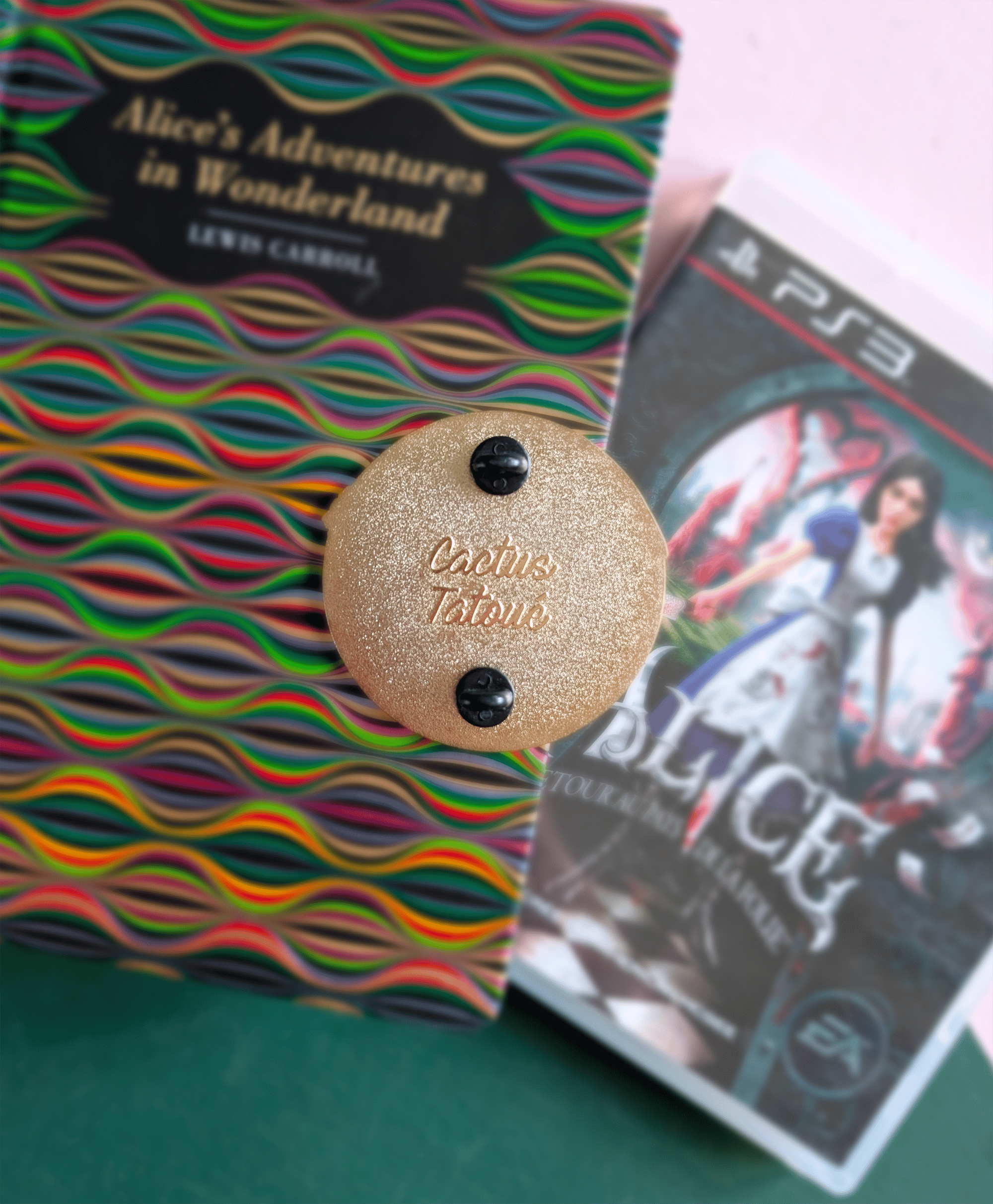 Large pin's en émail doré "hard enamel" avec fond à paillettes grises.