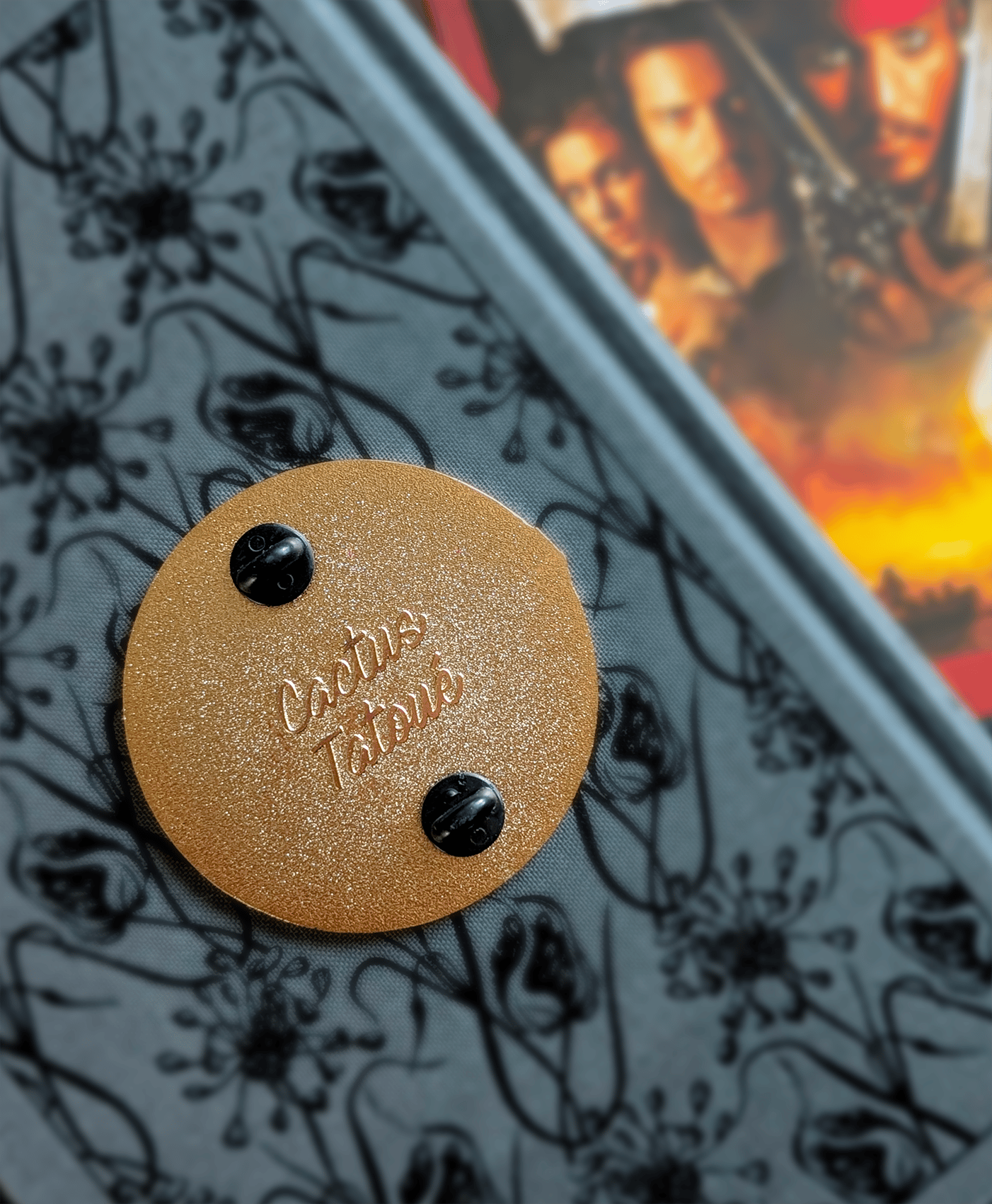 Large pin's en émail doré "hard enamel" avec fond à paillettes rouges.