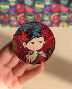 Large pin's en émail doré "hard enamel" avec fond à paillettes rouges.